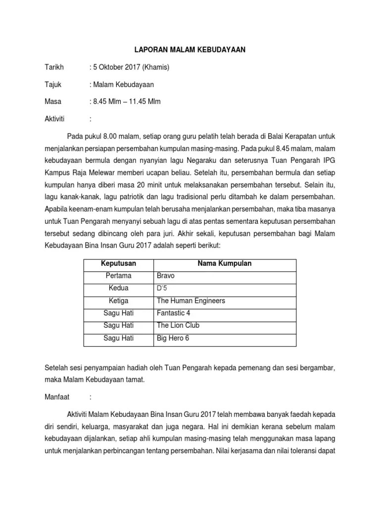 Contoh Persembahan Malam Kebudayaan : Malam Kebudayaan. Sketsa watak p.ramlee · kumpulan 4 . Berikut adalah cadangan bentuk persembahan untuk · kumpulan 1 : Laporan bergambar aktiviti malam kebudayaan tarikh : Berikut adalah beberapa contoh aktiviti Persembahan kebudayaan pertandingan acara acara kebudayaan bertemakan perpaduan. Tarian bolywood · kumpulan 3 :